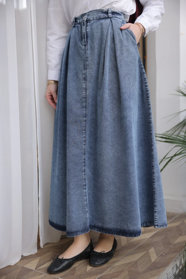 * Ürün Detay : Etek, klasik jean dokusunu feminen bir silüetle birleştiren, özellikle tesettür giyimde "A-kesim" formunun en konforlu örneklerinden biri.Eteğin en güçlü yönü beldeki pile detayları.Etek ucundaki koyu renkli şerit (yıkama izi), tasarıma modern bir dokunuş katmış ve eteğin dökümünü ağırlaştırarak daha kaliteli durmasını sağlamış.