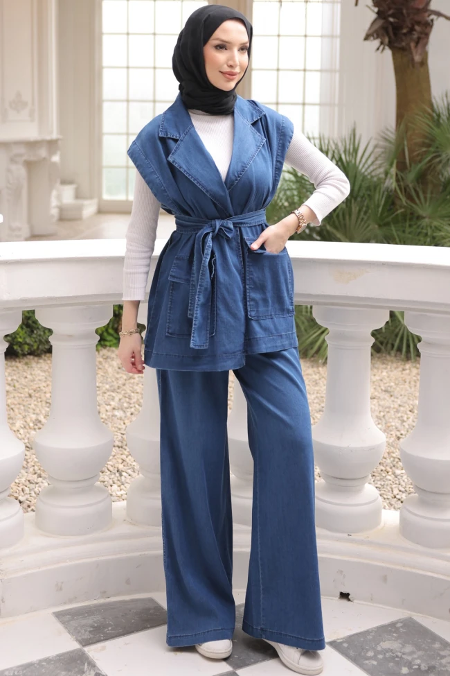 * Ürün Detay : Modern muhafazakar giyimin en trend parçalarını bir araya getiren bu iki parçalı denim takım, konforu ve zarafeti aynı anda sunuyor.Geniş yaka (rever yaka) detayıyla modern bir hava sunar. Belindeki ayarlanabilir kuşak sayesinde bel formunu ön plana çıkarır. Fonksiyonel yan cepleri ve kolsuz kesimiyle farklı bluz veya gömleklerle kombinlemeye uygundur.Yüksek bel kesimine sahip bol paça (wide-leg) tasarımı, silüetinizi daha uzun ve zarif gösterir. Rahat kalıbı sayesinde tesettür giyim standartlarına tam uyum sağlar.Pantolon bel lastikli yüksek bel ve ceplidir.