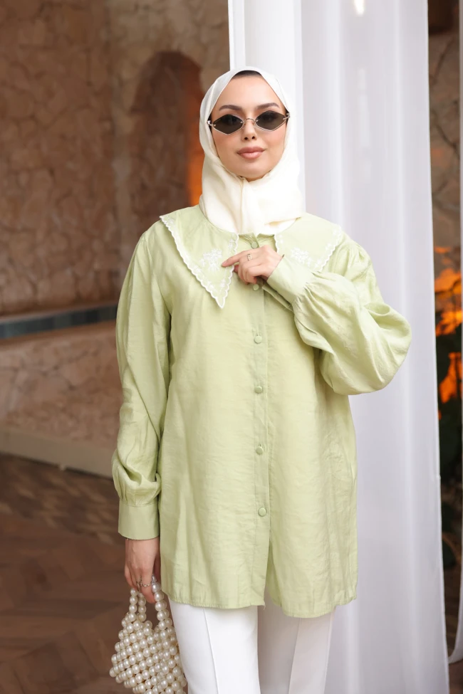 * Ürün Detay : Gömlek, özellikle vintage esintili modern kıyafetleri sevenler için gardırobun yıldızı olmaya aday.Romantik detaylar ile modern kesimi birleştiren, oldukça enerjik bir parça. Bahar ve yaz koleksiyonları için harika bir seçenek.Gömleğin en dikkat çekici özelliği, üzerinde zarif nakış işlemeleri bulunan geniş bebe yakası. Bu detay, tasarıma nostaljik ve romantik bir hava katarken, ürünü sıradan bir gömlekten ayırıp butik bir parça haline getiriyor.Balon kol formundaki geniş kesim ve manşet detayları, tesettür giyimde aranan o dökümlü ve konforlu görünümü destekliyor.
