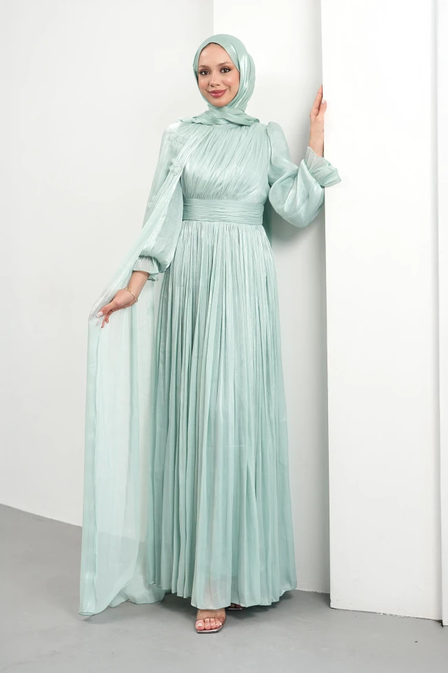 * Ürün Detay :Abiye modelimiz modest bir çizgide oldukça zarif bir görünüm sunuyor.Elbisenin tamamında kullanılan dikey plise detayları, boyu olduğundan daha uzun göstermek için harika bir illüzyon sağlıyor. Beldeki kalın kuşak detayı, vücut hatlarını zarifçe belirginleştirerek proporsiyonu dengeliyor.Omuzdan aşağıya doğru süzülen şifon pelerin detayı, elbiseye hareket ederken uçuş uçuş bir görünüm sağlayarak asalet katıyor.