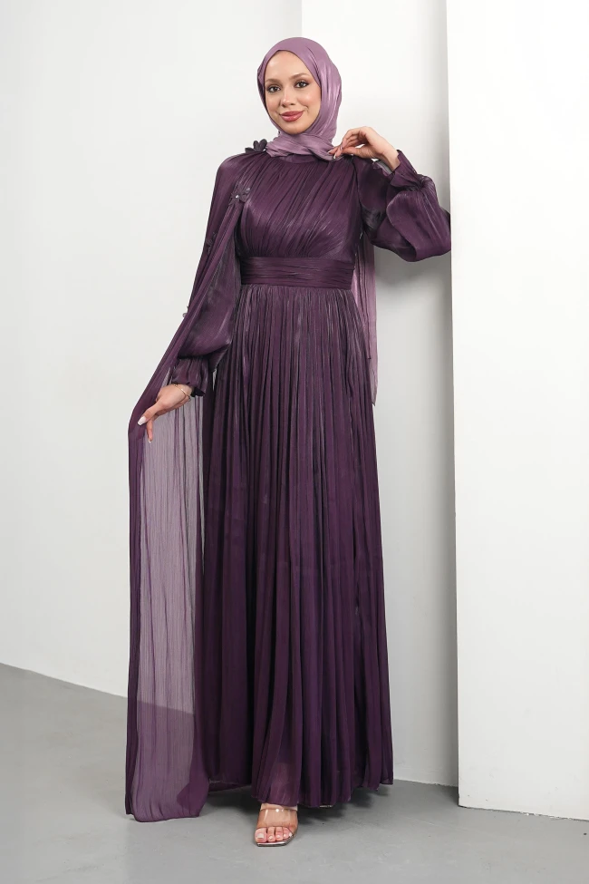 * Ürün Detay :Abiye modelimiz modest bir çizgide oldukça zarif bir görünüm sunuyor.Elbisenin tamamında kullanılan dikey plise detayları, boyu olduğundan daha uzun göstermek için harika bir illüzyon sağlıyor. Beldeki kalın kuşak detayı, vücut hatlarını zarifçe belirginleştirerek proporsiyonu dengeliyor.Omuzdan aşağıya doğru süzülen şifon pelerin detayı, elbiseye hareket ederken uçuş uçuş bir görünüm sağlayarak asalet katıyor.