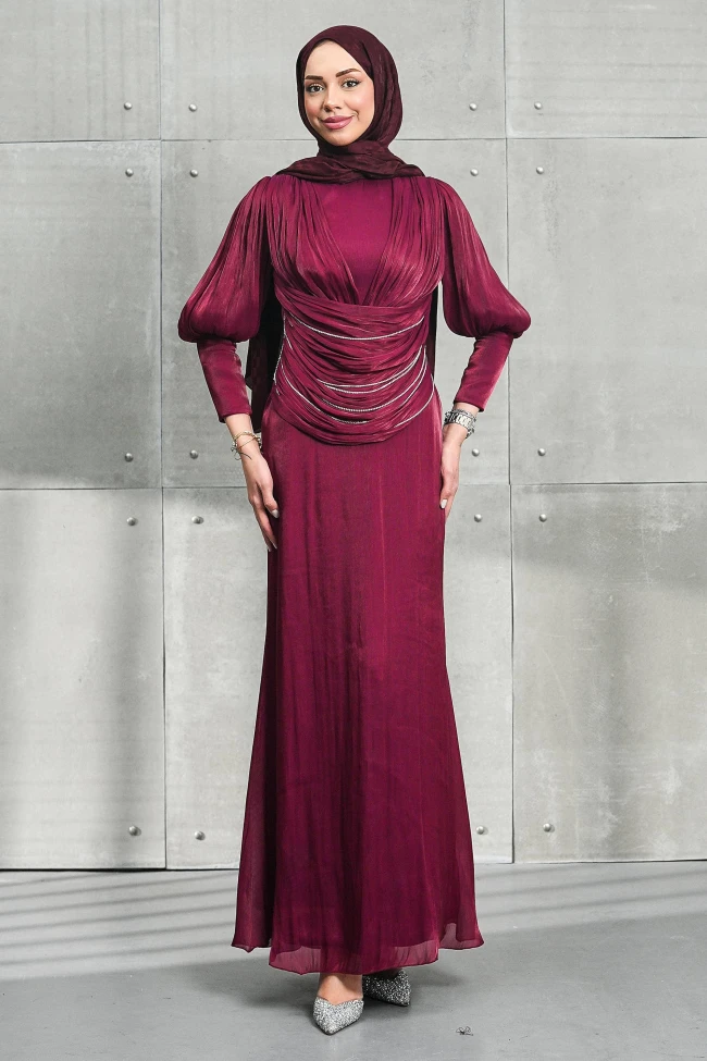 * Ürün Detay : Abiye, hem dramatik detayları hem de zarif siluetiyle oldukça iddialı bir model.Elbisenin üst kısmındaki çapraz drapeler ve bel bölgesindeki ince gümüş zincir detayları, tasarıma derinlik katmış. Bu detaylar hem hareket kazandırıyor hem de bel hattını zarifçe vurguluyor.Dirsek üzerine kadar bol gelen ve bilekte daralan manşetlerle birleşen balon kollar, elbiseye romantik ve modern bir hava katmış. Bu kol kesimi, omuz ve göğüs bölgesindeki drapelerle uyum sağlıyor.Belden aşağıya doğru hafifçe genişleyerek inen düz kesim, üst taraftaki yoğun detayları dengeleyerek boyu daha uzun gösteren bir illüzyon yaratıyor.Kol ve sırt fermuarlıdır.