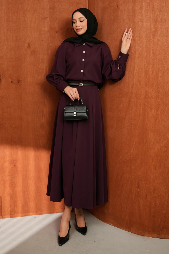 * Ürün Detay : Gömlek-etek takımı, tek renk şıklığın ve eforsuz zarafetin çok başarılı bir örneği. Hem profesyonel hem de günlük kullanım için oldukça güçlü bir duruş sergiliyor.Balon kol detayı ve manşetlerdeki düğmeler, klasik bir gömleğe modern ve feminen bir hava katmış.Yüksek bel ve kloş kesim, silüeti oldukça zarif gösteriyor. İnce kemer, bel hattını belirginleştirerek takımı iki parça olmaktan çıkarıp bütünsel bir görünüm kazandırmış.