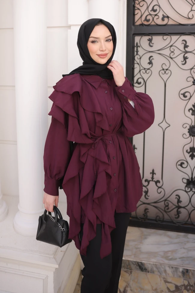 * Ürün Detay : Tunik, hem modern hem de oldukça iddialı bir tasarıma sahip.Tunikteki en dikkat çekici unsur, omuzdan aşağıya doğru asimetrik bir şekilde inen katlı volanlar.Beldeki ince kuşak, dökümlü kumaşı toparlayarak vücut hatlarını daha dengeli göstermiş.Manşetli ve hafif balon kol yapısı, tuniğin feminen ve romantik havasını destekliyor.