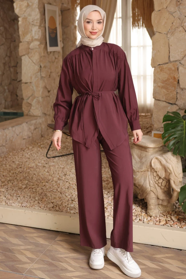 * Ürün Detay : Takım, hem modern hem de zarif bir çizgiye sahip. Özellikle modest giyimde konfor ve şıklığı bir araya getiren başarılı bir seçim olmuş.Hakim yaka detayı modern bir hava katmış. Beldeki ince kuşak, bol kesimi dengelerken silüeti daha zarif gösteriyor. Omuz ve göğüs kısmındaki hafif büzgüler ise takıma hareket katmış.Geniş paça pantolon tercihi, hem hareket özgürlüğü sağlıyor hem de tuniğin uzunluğuyla orantılı bir görünüm sunuyor.