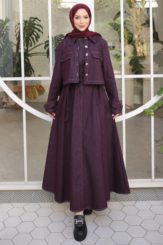 * Ürün Detay : Takımı, klasik jean dokusunu modern ve feminen bir formla buluşturan oldukça etkileyici bir parça.Kısa kesim ceket, alt parçadaki uzun ve dökümlü elbiseyi dengeleyerek boyu daha uzun gösteriyor. Geniş yakalar ve metal düğmeler, takıma hem güçlü hem de şık bir hava katmış.A-kesim etek formu, beldeki kemerle birleşince çok zarif bir silüet oluşturuyor. Belin vurgulanması, denim kumaşın sertliğini kırarak daha yumuşak bir duruş sağlamış.Parçaların üzerindeki belirgin beyaz dikişler, tasarıma mimari bir derinlik katıyor ve kıyafetin hatlarını çok net bir şekilde ortaya çıkarıyor.