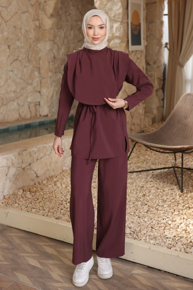 * Ürün Detay : Tunik pantolon takımı, modern ve sofistike bir tesettür kombini arayanlar için oldukça şık bir seçenek.Takımın en dikkat çekici kısmı, göğüs üzerinde pelerin tarzı dairesel bir kesime sahip olan tunik. Omuzlardaki gold düğme detayları takıma hoş bir hava ve zarafet katmış.İnce kuşak detayı beli vurgulayarak vücut formunu orantılı gösterirken, tuniğin hafif dökümlü alt kısmı konfor sağlıyor.Bol paça kesimi hem rahatlık sunuyor hem de modern silüeti tamamlıyor.