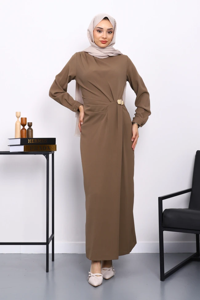 Siyah Önü Drapeli Tokalı Krep Elbise Mürdüm Önü Drapeli Tokalı Krep Elbise Kahverengi Önü Drapeli Tokalı Krep Elbise Lacivert Önü Drapeli Tokalı Krep Elbise