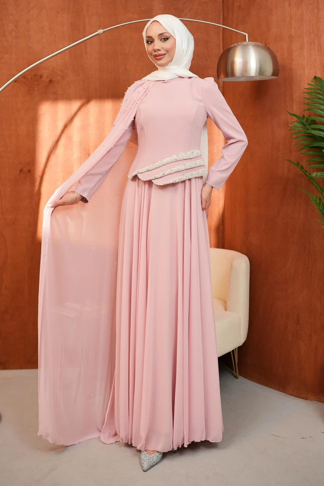 * Ürün Detay : Abiye, hem asalet hem de modern detayları bir araya getiren, oldukça karakteristik bir parça.Omuzdan dökülen şifon pelerin üzerindeki inci işlemeleri, elbiseye masalsı bir hava katmış. Bel kısmındaki yatay inci şeritleri ise vücut formunu bölmeden zarif bir kemer illüzyonu yaratarak beli vurgulamış.Tek taraflı pelerin kullanımı, asimetrik bir modernlik katıyor. Hareket ettikçe uçuşan bu detay, özel davetlerde ve düğünlerde oldukça fotojenik bir duruş sergileyecektir.Etek kısmının dökümlü ve hafif olması, üst bedendeki yapısal duruşla güzel bir kontrast oluşturmuş. Tesettür giyim standartlarına uygun, vücut hatlarını çok belli etmeyen ama silüeti zarif gösteren bir kesime sahip.Sırt fermuarlıdır.