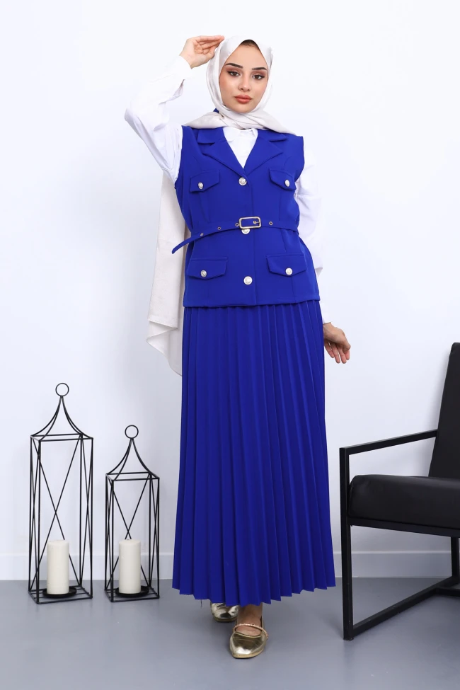 * Ürün Detay : Ürünümüz Krep kumaştan üretilmiştir. Yelek ile Etek ikili takım şeklindedir. Etek bel kısmı lastiklidir. Yelek ön düğmeli ve kemerlidir.