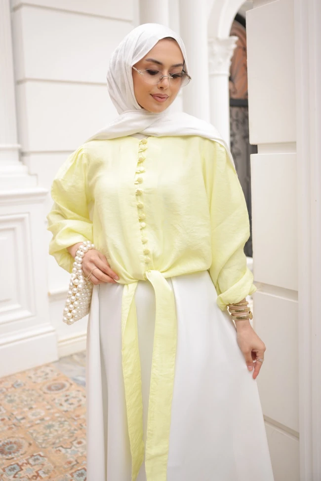 * Ürün Detay : Balon kol detayıyla hareketlenen tasarımı, ister eteklerle ister yüksek bel pantolonlarla kombinleyerek stilinizi konuşturun.Kumaşın hafif dokulu yapısı, ürünün hem günlük hem de şık ortamlarda kullanılabilir olduğunu gösteriyor.Boydan boya uzanan kumaş kaplama düğmeler, gömleğe vintage ve özenilmiş bir hava katıyor. Özellikle bel kısmındaki bağlama detayı, ürüne modern bir hareket katarken bel formunu zarifçe vurguluyor.