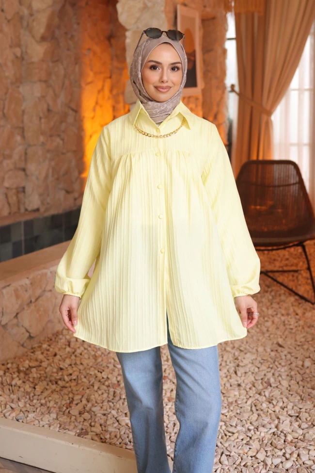 * Ürün Detay : Gömlek, özellikle bahar ve yaz ayları için ideal olan, oldukça ferah ve dinamik bir parça.Gömleğin boyuna çizgili, kendinden dokulu yapısı elbiseye derinlik katıyor. Göğüs altından başlayan hafif büzgü ve piliseler, gömleğe bohem ve rahat bir hava vermiş.Rahat ve dökümlü kesimi sayesinde gün boyu konfor sunarken, vücut hatlarını belli etmeyen yapısıyla muhafazakar bir şıklık sağlıyor.Klasik gömlek yakası, kollarındaki lastikli manşetler ile dengelenmiş.