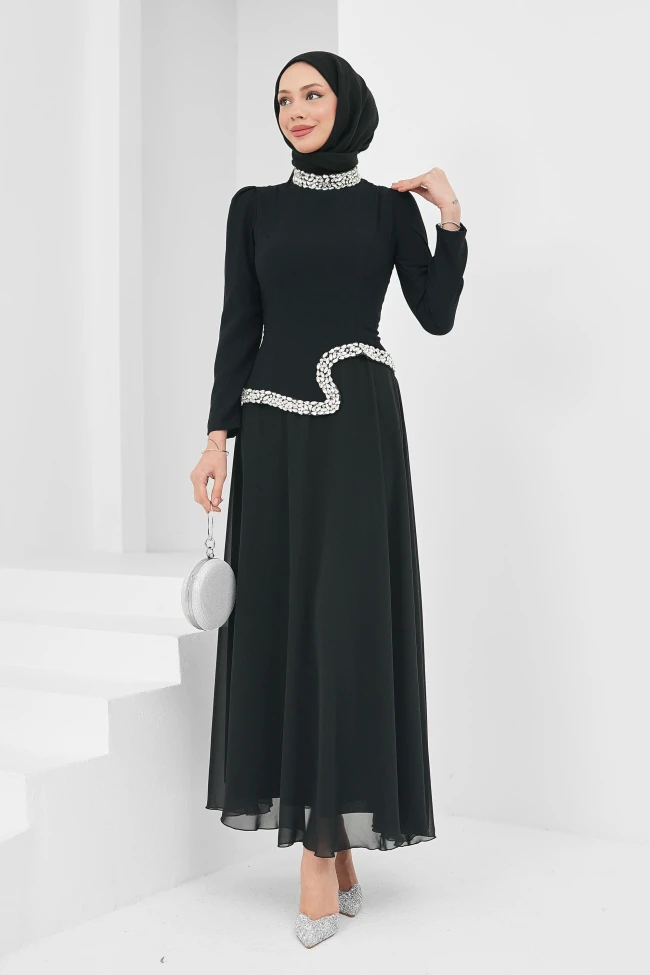 * Ürün Detay : Zamansız şıklık temasını modern taş detaylarıyla birleştiren, oldukça zarif ve rafine bir abiye model ile karşınızdayız.Elbisenin en dikkat çekici özelliği, yaka ve bel hattında kullanılan geniş taş işlemeleri. Yaka kısmındaki taşlar bir kolye etkisi yaratarak yüze ışıltı katarken, beldeki asimetrik kıvrımlı taş hattı silüeti bölerek beli daha ince gösteren bir optik illüzyon yaratıyor.Üst beden daha tok ve formu koruyan bir kumaştan tercih edilmişken, etek kısmında kullanılan hafif şifon doku, elbiseye uçuş uçuş bir hava ve feminen bir hareketlilik kazandırmış.Omuzlardaki hafif büzgüler ve düz kol kesimi, taşların yarattığı ihtişamı dengeleyerek tasarımın asaletini korumasını sağlıyor.özel günlerde "garanti şıklık" arayan, hem klasik hem de modern detayları seven müşteri kitlesi için bu parça ideal bir seçenek olacaktır.
