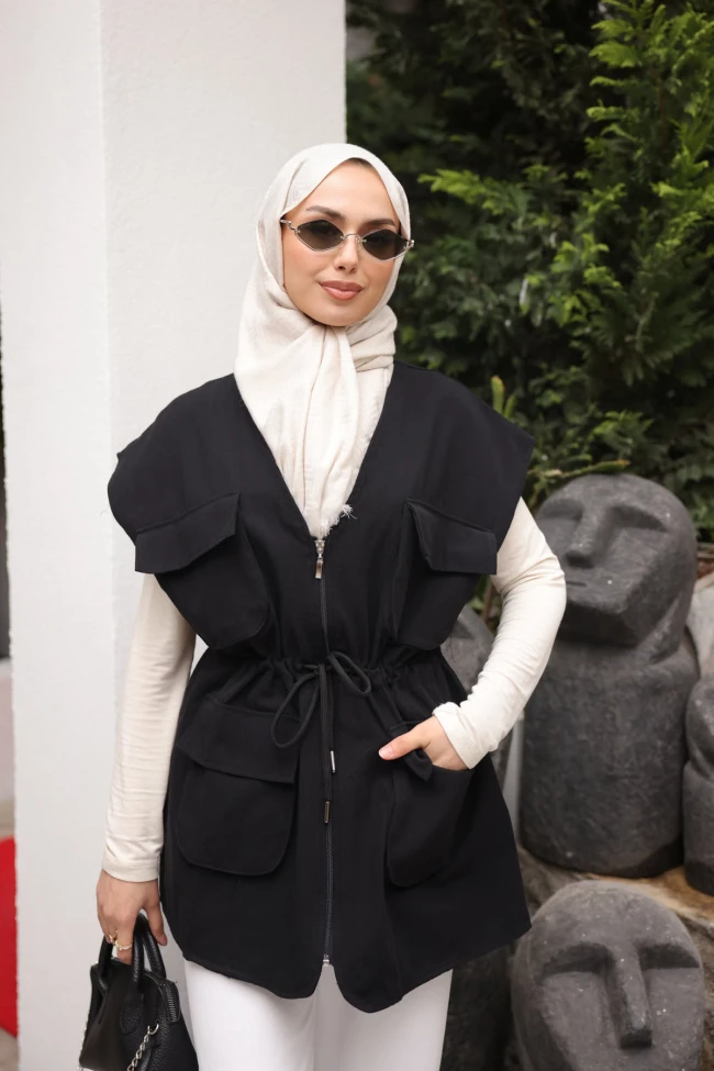 * Ürün Detay : Özellikle geçiş mevsimleri için tasarlanmış, işlevsel ve modern bir parça olarak öne çıkıyor.Üzerindeki dört adet büyük kapaklı cep, yeleğe hem maskülen bir hava katıyor hem de son yılların popüler işlevsel giyim trendine hitap ediyor.Belden büzgülü ve ayarlanabilir ipli yapısı, oversize duruşu bozmadan vücut formuna göre ayarlanabilmesine olanak tanıyor.