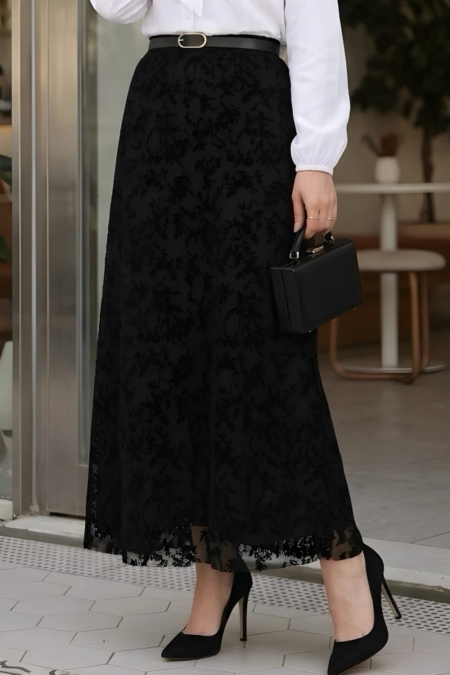 * Ürün Detay : Etek, dokusu ve desenleriyle oldukça romantik ve vintage bir hava taşıyor. Özellikle kumaşın katmanlı yapısı, tasarıma derinlik katmış.İnce kemer kullanımı, beli vurgulayarak silüeti toplu gösteriyor. Bu küçük aksesuar dokunuşu, eteğin daha profesyonel ve "tamamlanmış" durmasını sağlamış.A kesim , her vücut tipine uyum sağlayan ve tesettür giyimde konforu ön plana çıkaran bir seçim. Eteğin dökümü, tülün hafifliği sayesinde oldukça akışkan görünüyor.