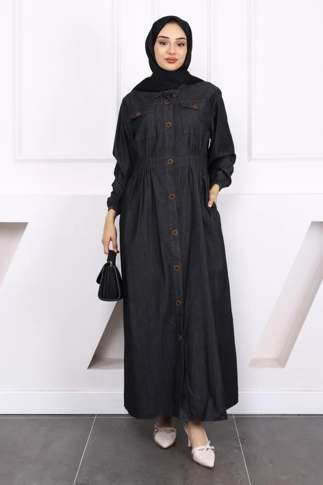 Mavi Bel Lastikli Dügmeli Kot Elbise