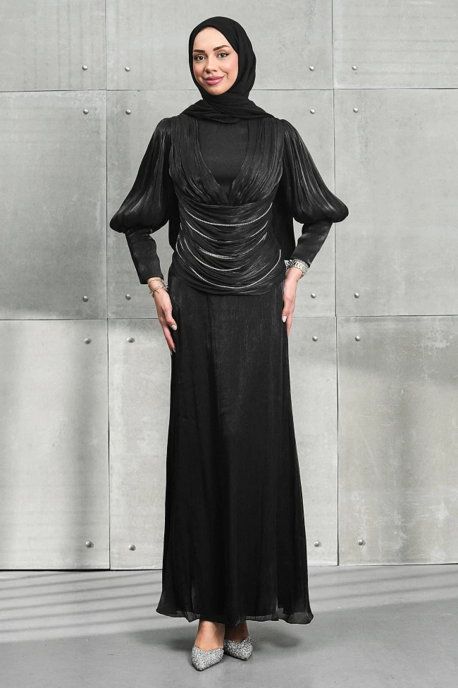 * Ürün Detay : Abiye, hem dramatik detayları hem de zarif siluetiyle oldukça iddialı bir model.Elbisenin üst kısmındaki çapraz drapeler ve bel bölgesindeki ince gümüş zincir detayları, tasarıma derinlik katmış. Bu detaylar hem hareket kazandırıyor hem de bel hattını zarifçe vurguluyor.Dirsek üzerine kadar bol gelen ve bilekte daralan manşetlerle birleşen balon kollar, elbiseye romantik ve modern bir hava katmış. Bu kol kesimi, omuz ve göğüs bölgesindeki drapelerle uyum sağlıyor.Belden aşağıya doğru hafifçe genişleyerek inen düz kesim, üst taraftaki yoğun detayları dengeleyerek boyu daha uzun gösteren bir illüzyon yaratıyor.Kol ve sırt fermuarlıdır.