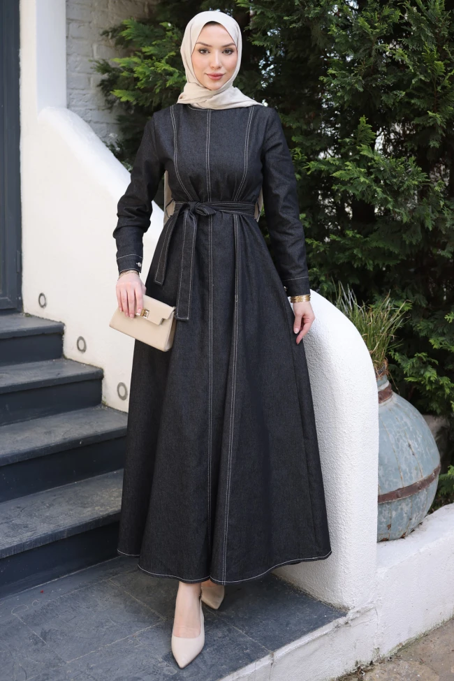 * Ürün Detay :Eğer sadelikten yanaysanız ama küçük detaylarla fark oluşturmak istiyorsanız bu elbise tam size göre.Beyaz dikiş detayları ile hoş bir dokunuş sağlanmışş Koyu zemin üzerinde bu çizgiler daha belirgin hale gelerek elbiseye geometrik bir düzen ve modern bir dokunuş kazandırmış.Kullanılan geniş ve bağlamalı kuşak, beli daha vurgulu hale getiriyor ve elbiseye feminen bir hava katıyor.Uzun kolların uçlarındaki dikiş detayları, bütünlüğü bozmadan tasarımı tamamlamış.