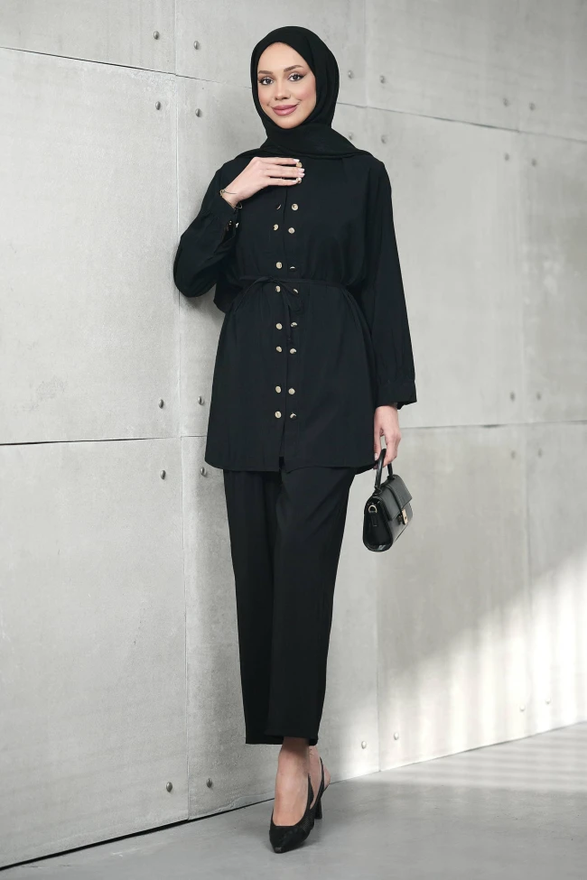 * Ürün Detay : "Hani o 'ne giysem?' dediğiniz anlar vardır ya... İşte o anların kurtarıcısı burada! Modern kesimi ve asil tonuyla bu takım, size hem çok iyi hissettirecek hem de çok şık gösterecek. İnce kuşak detayı çok yerinde bir dokunuş olmuş. Bol kesim bir takımı tek düze olmaktan kurtarıp, beli hafifçe vurgulayarak daha kadınsı ve düzenli bir silüet oluşturmuş.Ön kısımdaki çift sıralı metalik düğmeler takıma hoş bir esinti katıyor.