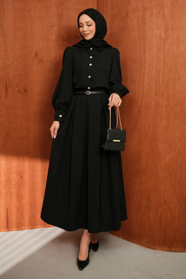 * Ürün Detay : Gömlek-etek takımı, tek renk şıklığın ve eforsuz zarafetin çok başarılı bir örneği. Hem profesyonel hem de günlük kullanım için oldukça güçlü bir duruş sergiliyor.Balon kol detayı ve manşetlerdeki düğmeler, klasik bir gömleğe modern ve feminen bir hava katmış.Yüksek bel ve kloş kesim, silüeti oldukça zarif gösteriyor. İnce kemer, bel hattını belirginleştirerek takımı iki parça olmaktan çıkarıp bütünsel bir görünüm kazandırmış.