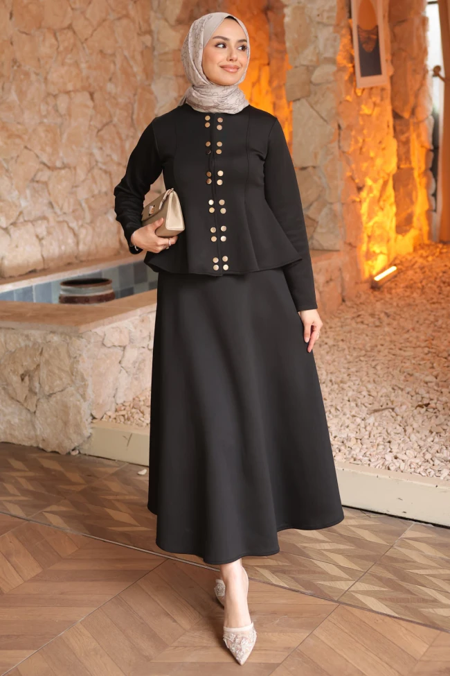 * Ürün Detay : Düğmeler, takıma lüks ve resmi bir hava katıyor. Bu tür metalik detaylar, ürünü "premium" kategorisine yükseltmektedir.Ceketin belden aşağıya doğru genişleyen formu, bel hattını vurgulayarak zarif bir silüet oluşturuyor. Aynı zamanda basen bölgesini kamufle ettiği için müşterilerimiz tarafından oldukça talep gören bir kesimdir.Takımı tamamlayan geniş kesim etek, hareket özgürlüğü sağlarken klasik duruşu destekliyor.