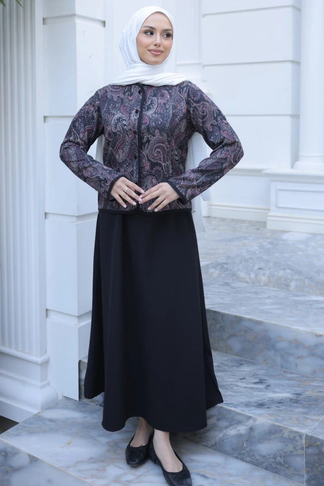 * Ürün Detay : Geleneksel motiflerin modern kesimlerle buluştuğu bu özel tasarım ikili takım, gardırobunuzun en asil parçası olmaya aday. Hem günlük şıklığınızda hem de özel davetlerde zahmetsiz bir zarafet sunan bu takım, renklerin en derin tonuyla sofistike bir duruş sergiliyor.Ceketteki ince işlenmiş şal desenleri, tasarıma derinlik ve karakter katar. Klasik dokusuyla modası geçmeyen bir şıklık sunar.Gün boyu hareket özgürlüğü sağlayan rahat kesimi, vücut hatlarını zarifçe gizleyen dökümlü yapısıyla konforu ön planda tutar.Etek bel lastiklidir.