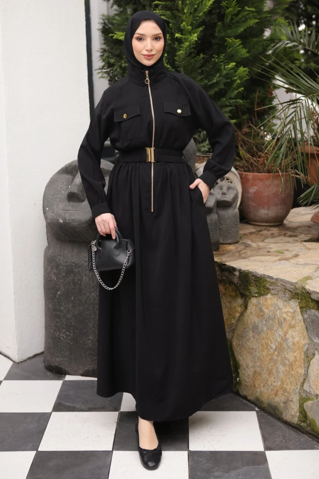 * Ürün Detay : Elbise, modern tesettür giyimde işlevsel stilinin şık bir birleşimi olarak öne çıkıyor.Hakim yaka ve boydan fermuar detayı, elbiseye dinamik ve modern bir hava katıyor. Özellikle fermuarlı yapısı, giyim kolaylığı sağladığı için pratiklik arayan müşteriler için büyük bir avantajdır.Göğüs kısmındaki kapaklı cep detayları, klasik elbise formunu hareketlendirerek daha spor bir görünüm kazandırmış. Ayrıca yan cepler , son yıllarda kadın giyiminde en çok aranan konfor özelliklerinden biridir.Lastikli ve metal tokalı kemer detayı, bel bölgesini toparlayarak daha ince bir silüet oluşturuyor.