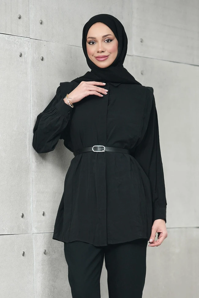 * Ürün Detay : Tunik, hem günlük kullanım hem de ofis şıklığı için oldukça dengeli ve modern bir tasarıma sahip.Tunikteki en dikkat çekici unsur, omuzlardan göğüs hizasına inen fırfır veya apolet benzeri dikey şeritler.Manşetli ve hafif dökümlü kollar, tuniğe klasik bir gömlek havası katarken kullanım konforunu artırıyor.İnce bir kemerle kombinlenmesi, tuniğin bol kesiminden kaynaklanabilecek görünümü engelliyor ve vücut hatlarını zarifçe belli ediyor.