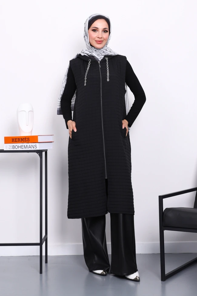 Taş Kapitone Fermuarlı Kapşonlu Yelek Kahverengi Kapitone Fermuarlı Kapşonlu Yelek