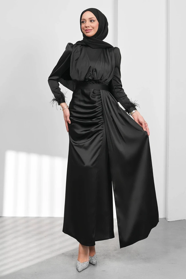 * Ürün Detay : “Renklerin tutkusu, satenin asaletiyle buluştu”. Bileklerdeki tüy detayları, son yılların en büyük trendlerinden biri. Bu küçük dokunuş, elbiseye hem hareket katıyor hem de özel tasarım hissi veriyor.Karın bölgesindeki drapeler, silüeti toparlarken modern bir hava katmış. Beldeki kuşak detayı ise bel oyuntusunu vurgulayarak daha fit bir görünüm sağlıyor.