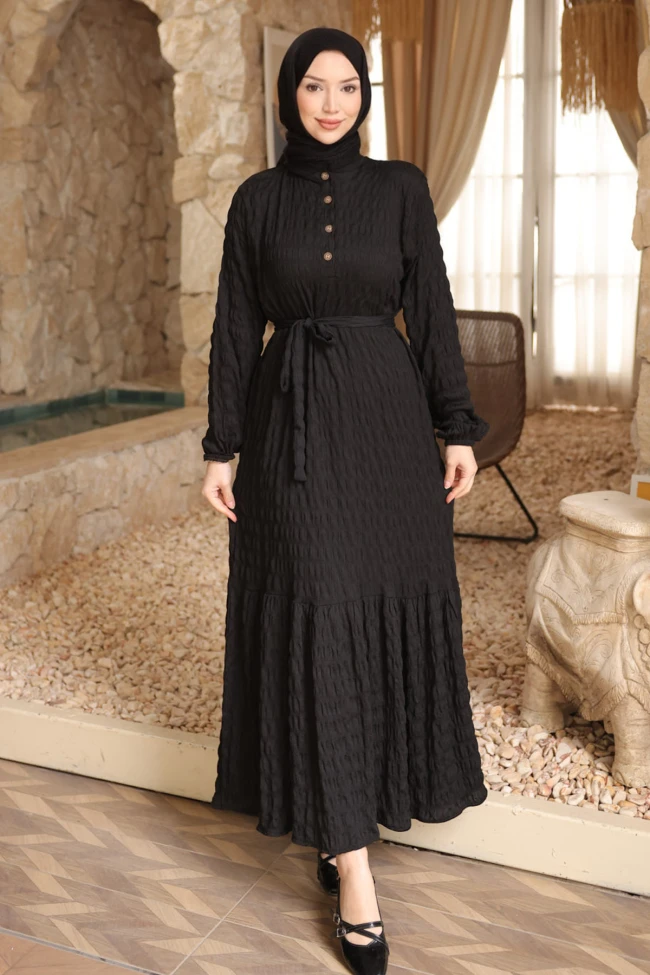 * Ürün Detay : Elbise, hem dokusu hem de kesimiyle oldukça şık ve modern bir tesettür giyim örneği sunuyor.Elbisenin en dikkat çekici özelliği, kumaşın kendinden kabartmalı bürümcük dokusu.Göğüs kısmındaki yarım patlı düğme detayları, elbiseye hafif bir spor-şık hava katmış.Kendi kumaşından olan kuşak, bel hattını belirginleştirerek daha feminen bir silüet oluşturuyor.Etek ucundaki hafif volan detayı, elbiseye hareket ve romantik bir hava katmış.