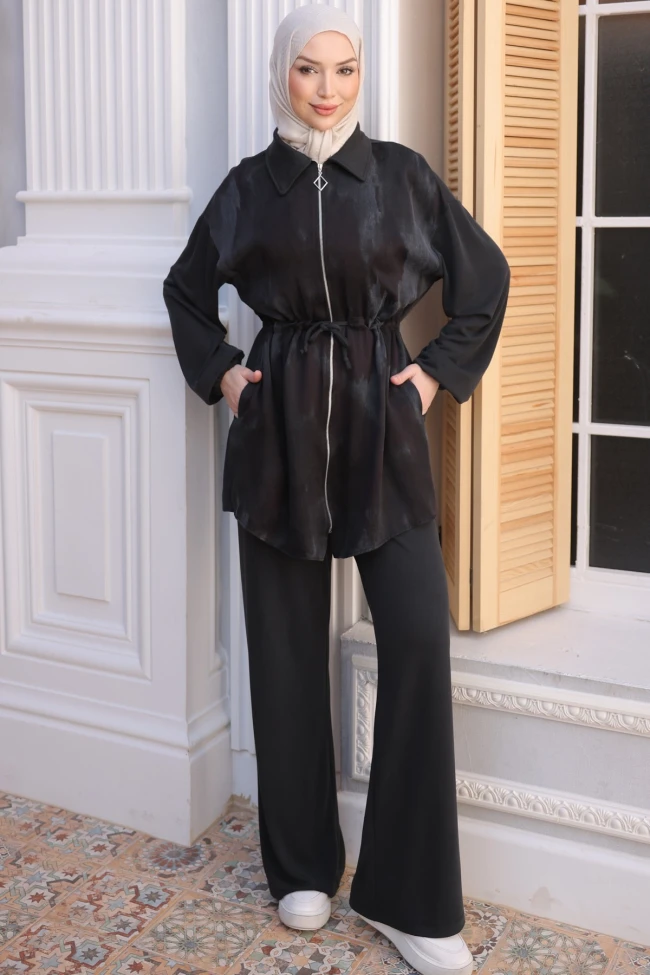 * Ürün Detay : Günlük stilinize modern bir dokunuş katmaya ne dersiniz? Hem konforundan ödün vermeyen hem de şıklığıyla göz dolduran bu özel tasarım ikili takım, gardırobunuzun en joker parçası olmaya aday.Üst parça, zarif desen geçişleri ve belden ayarlanabilir büzgü detayı ile vücut hatlarını naifçe dengeler. Fermuar detayı kullanım kolaylığı sağlarken, yaka tasarımı sportif bir şıklık sunar.Rahat kesim, geniş paça pantolon sayesinde gün boyu özgürce hareket edebilirsiniz.Pantolon bel lastiklidir.
