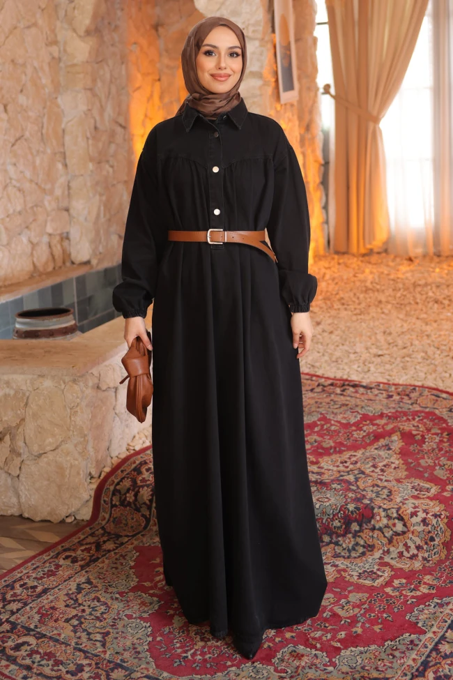 * Ürün Detay : Elbisemiz, denim şıklığını tesettür modasına çok zarif bir şekilde uyarlamış.Üst kısımdaki gömlek yaka tasarımı elbiseye ciddiyet katarken, göğüs hizasındaki hafif büzgülü roba detayı kesimi hareketlendirmiş.Belden aşağıya doğru genişleyen kesim, hem konforlu bir kullanım sunuyor hem de oldukça zarif bir silüet oluşturuyor.Ürünümüz kemerlidir.Satışa kemer dahildir.
