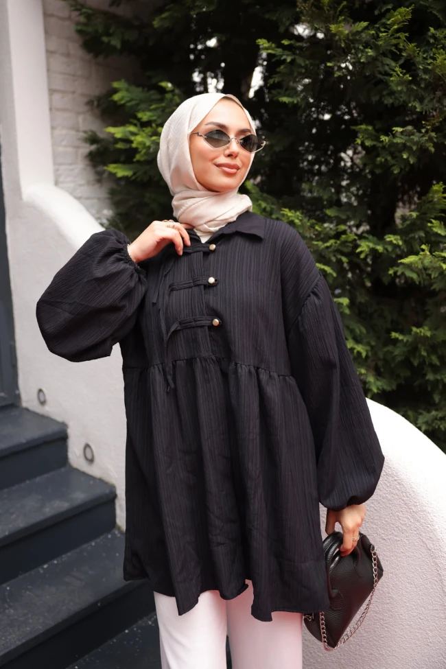 * Ürün Detay : Yeni sezon tunik modelimiz, özellikle modern tesettür giyiminde sıkça tercih edilen bohem ve konforlu bir tarza sahip.Tuniğin ön tarafındaki ince ip bağlama detayları,sıradan bir tunikten ayırıp "otantik" bir hava katmış.Robadan büzgülü ve geniş kesim olması, hem vücut hatlarını gizlemesi açısından avantajlı hem de içinde hareket etmeyi çok rahat kılıyor. Balon kollar ise tasarımı modernize etmiş.Kol manşetleri lastiklidir.