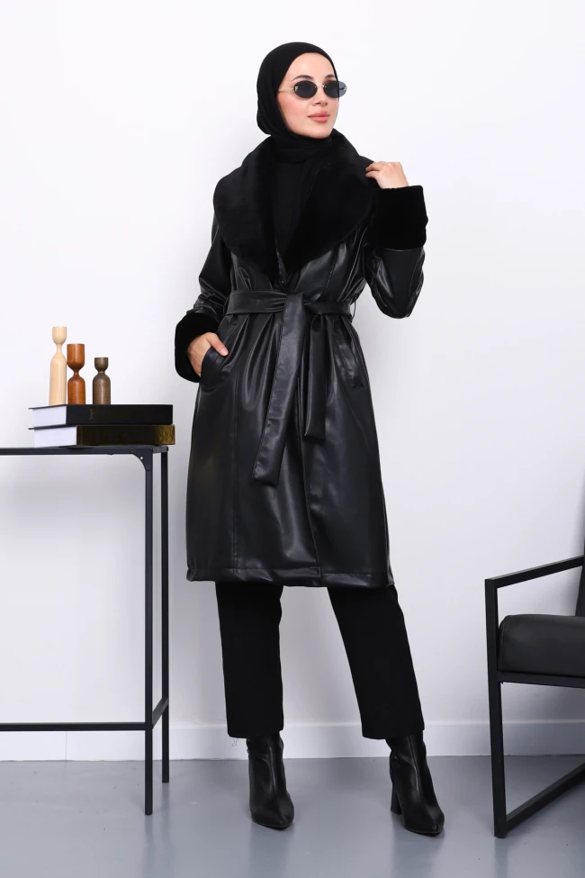 * Ürün Detay : Ürünümüz Suni Deri kumaştan üretilmiştir. Yaka kısmı kürk detaylıdır. Bel kısmı kuşaklıdır. Yan kısımları ceplidir.