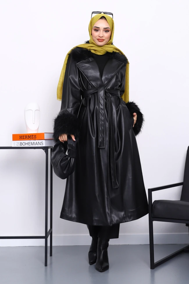 * Ürün Detay : Ürünümüz Suni Deri Kumaştan Üretilmiştir. Yaka ve kol kısımları kürk detaylıdır. Bel kısmı kuşaklı ve ceplidir.