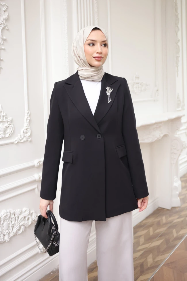 * Ürün Detay :Kendi özel broşuyla gelen, ek aksesuar gerektirmeyen hazır şıklık.Ceket, klasik blazer çizgisini modern ve feminen detaylarla birleştiren, özellikle özel günler ve ofis şıklığı için tasarlanmış çok zarif bir parça.İki düğmeli kruvaze kapanış sistemi, cekete güçlü ve resmi bir duruş katıyor. Geniş yapısı, omuz hattını daha belirgin ve şık gösteriyor.Yakadaki gümüş renkli, taşlı broş detayı ceketin en büyük fark yaratan unsuru.