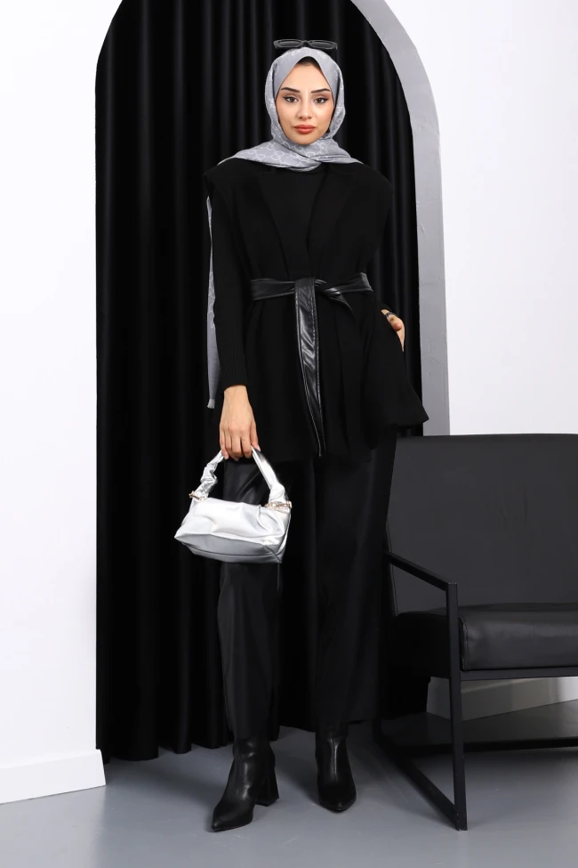 Taş Kuşaklı Çift Cepli Kaşe Yelek Antrasit Kuşaklı Çift Cepli Kaşe Yelek
