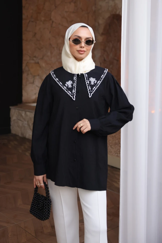 * Ürün Detay : Gömlek, özellikle vintage esintili modern kıyafetleri sevenler için gardırobun yıldızı olmaya aday.Romantik detaylar ile modern kesimi birleştiren, oldukça enerjik bir parça. Bahar ve yaz koleksiyonları için harika bir seçenek.Gömleğin en dikkat çekici özelliği, üzerinde zarif nakış işlemeleri bulunan geniş bebe yakası. Bu detay, tasarıma nostaljik ve romantik bir hava katarken, ürünü sıradan bir gömlekten ayırıp butik bir parça haline getiriyor.Balon kol formundaki geniş kesim ve manşet detayları, tesettür giyimde aranan o dökümlü ve konforlu görünümü destekliyor.
