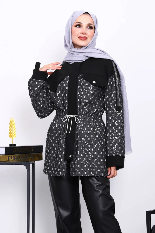 * Ürün Detay : Ürünümüz Kaşe kumaştan üretilmiştir. Ön kısmı fermuarlı olup, bel kısmı kulisan kemer detaylıdır. Omuz kısmında yapıştırma taş işlemeler yer almaktadır.