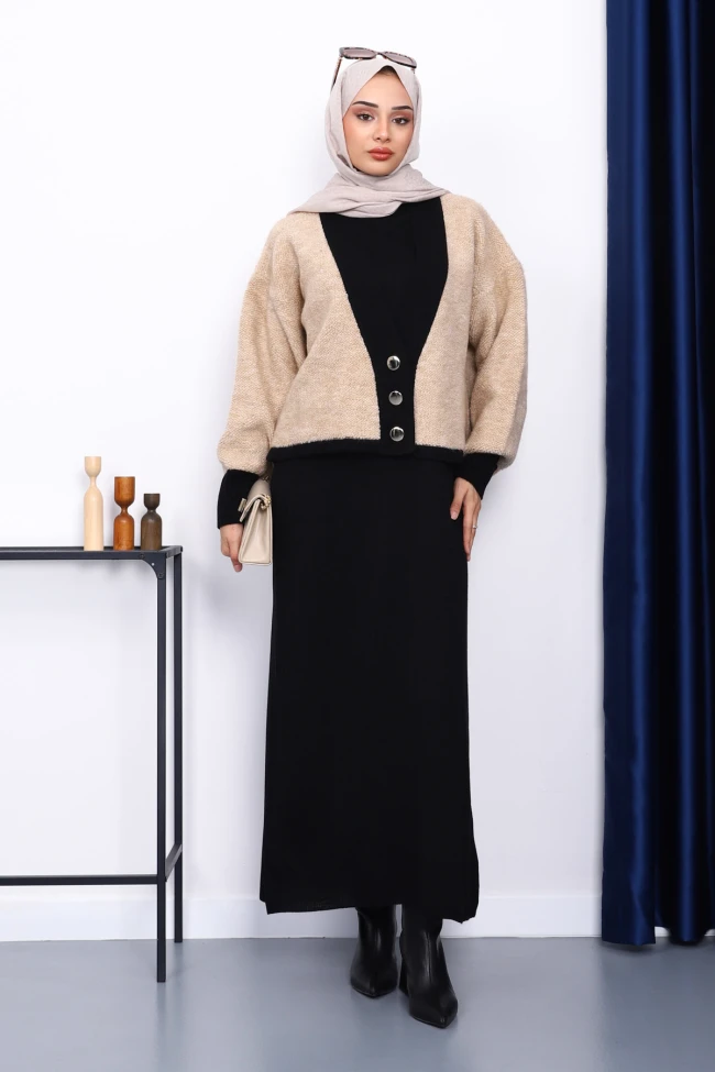 * Ürün Detay : Ürünümüz yeni sezona uygun Triko kumaştan üretilmiştir. Hırka ile Elbise ikili takım şeklindedir. Hırka ön düğmelidir.