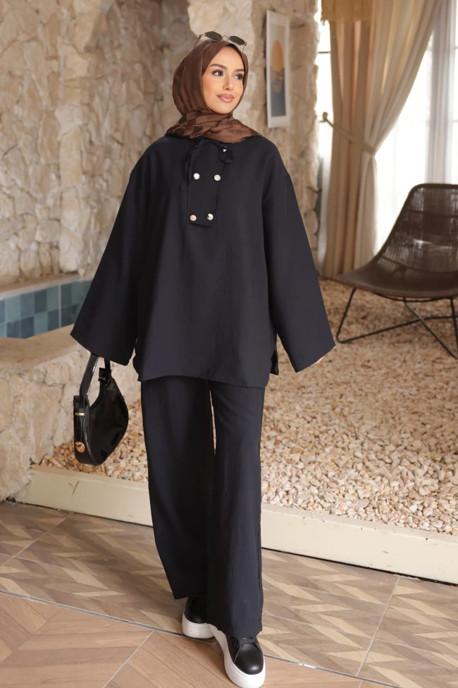 * Ürün Detay : İkili takım, "konforlu şıklık" akımının en net ve başarılı örneklerinden biri.Takımın en dikkat çekici özelliği, vücut hatlarını belli etmeyen oversize kesimi. Hem üst tunik hem de pantolon oldukça dökümlü durarak gün boyu hareket özgürlüğü vaat ediyor.Geniş ve hafif İspanyol kolu andıran kesimi, takıma modern ve ferah bir hava katmış.Göğüs kısmındaki panelde yer alan gold rengi düğmeler, renklerin düzlüğünü kırarak takıma anında daha lüks ve "tasarım" bir hava katmış.Yakadaki ince bağcık detayı, sportif bir dokunuş eklerken aynı zamanda boyun bölgesine hareket kazandırmış.