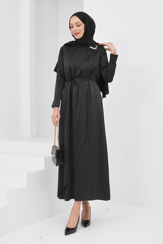 * Ürün Detay : Abiyemiz, sadeliği asil bir dokuyla birleştiren, oldukça rafine bir parça.Abiyenin en büyük özelliği, ipeksi bir parlaklığa sahip saten dokulu kumaşı.Göğüs kısmından başlayıp bel hattına doğru uzanan asimetrik kruvaze kesim, elbiseye modern bir hava katmış. Beldeki hafif büzgüler, kumaşın akışkanlığını vurgularken vücut hatlarını zarifçe şekillendiriyor.Kapalı yaka tasarımı, omuz bölgesinde kullanılan aksesuar ile hareketlendirilmiş. Beldeki ince ip kuşak ise bu sade şıklığı tamamlayan fonksiyonel bir detay olmuş.Düz ve bileğe doğru hafif daralan kol yapısı, tasarımın minimalist çizgisini destekliyor.