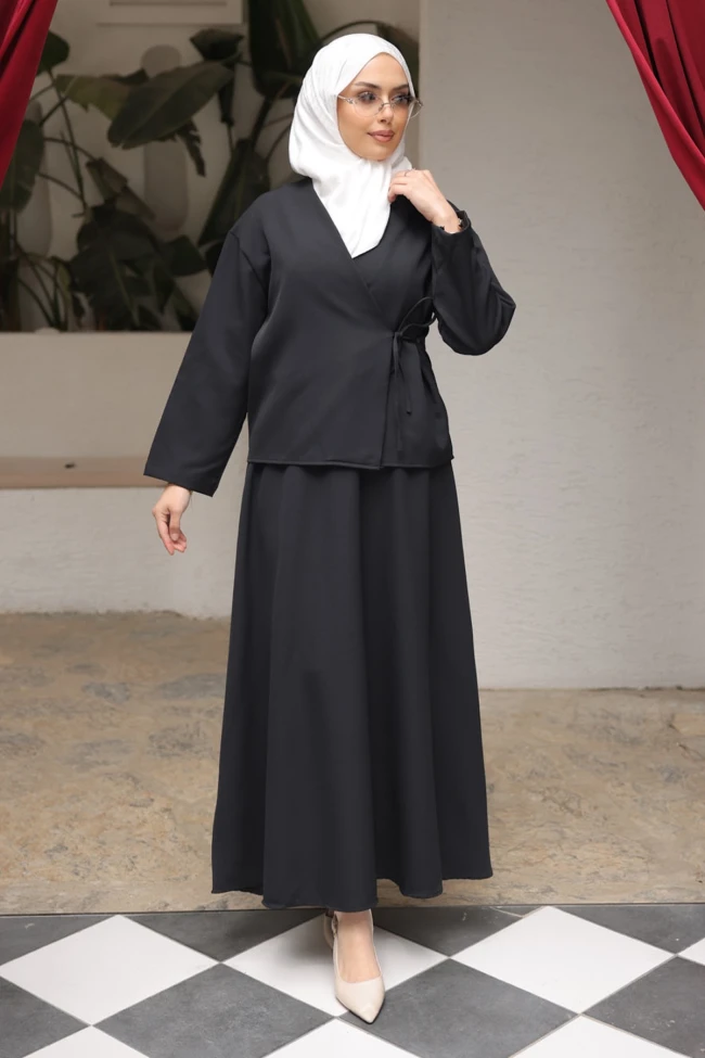 * Ürün Detay : Takım, "minimalist şıklık" ve "fonksiyonellik" kavramlarını bir araya getiren, zamansız bir tasarım. Özellikle kruvaze kesimi sayesinde klasik takımlardan ayrılan, oldukça modern bir duruş sergiliyor.Takımın en can alıcı noktası yan taraftan bağlamalı kruvaze kapama detayı. Bu kesim, hem vücut formunu daha ince ve zarif gösteriyor hem de elbiseye kimono havası katarak modern bir dokunuş sağlıyor.Belden aşağıya doğru genişleyen hafif A-kesim etek, tesettür giyimde aranan dökümlü ve hatları gizleyen yapıyı tam olarak karşılıyor.Etek bel lastiklidir.
