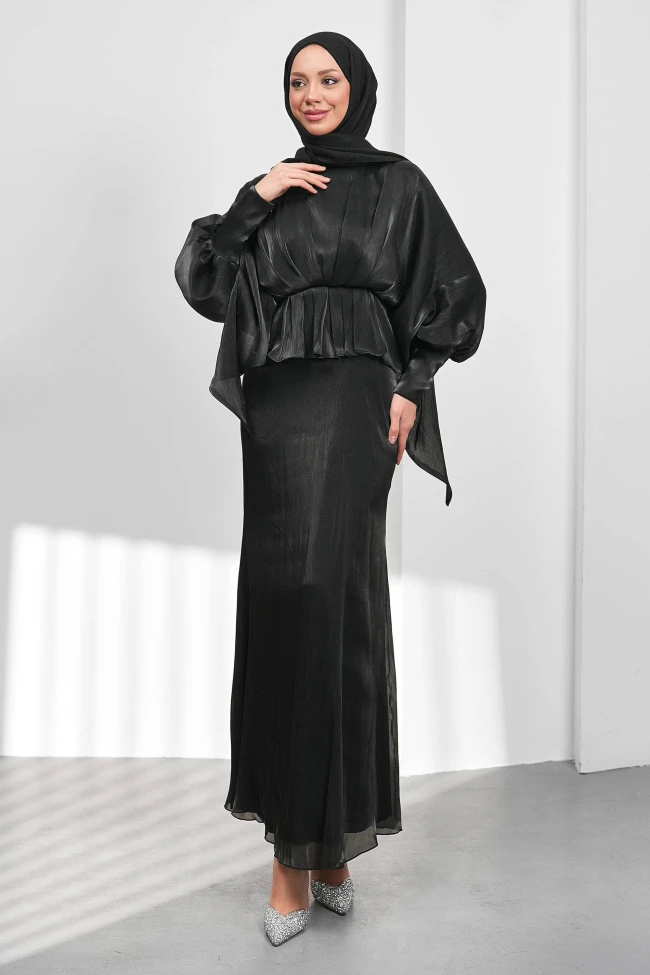 * Ürün Detay : “Geleneksel çizgileri modern bir sofistike anlayışla buluşturan abiye ile davetin en unutulmaz ismi siz olun!”Abiye, hem asaletini hem de modern tarzını ön plana çıkarmak isteyenler için tam bir "ikon" parçası.Beldeki büzgü ve peplum detayı, vücut hatlarını zarif bir şekilde dengelerken modern bir silüet oluşturuyor.Yarasa kol tasarımı, kıyafete hem hareket hem de dramatik bir şıklık katıyor.