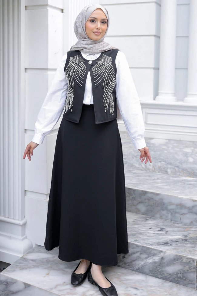 * Ürün Detay : Şık ve modern üçlü takım, zarafeti ve konforu bir araya getirerek günlükten özel davetlere kadar geniş bir kullanım yelpazesi sunuyor. Minimalist çizgileri, ışıltılı detaylarla birleştiren bu set, gardırobunuzun en joker parçalarından biri olmaya aday.Yelek, ön kısmında yer alan işlemeleriyle hareketlendirilmiştir. Kanat formundaki bu detaylar, tasarıma sofistike bir hava katar.Takımı tamamlayan temiz kesimli, düğmeli beyaz gömlek, kontrast oluşturarak şıklığı ön plana çıkarır.Yelek ile aynı tonda ve kumaş dokusunda tasarlanan maksi boy etek, yüksek beli ve dökümlü kesimiyle zarif bir silüet çizer.