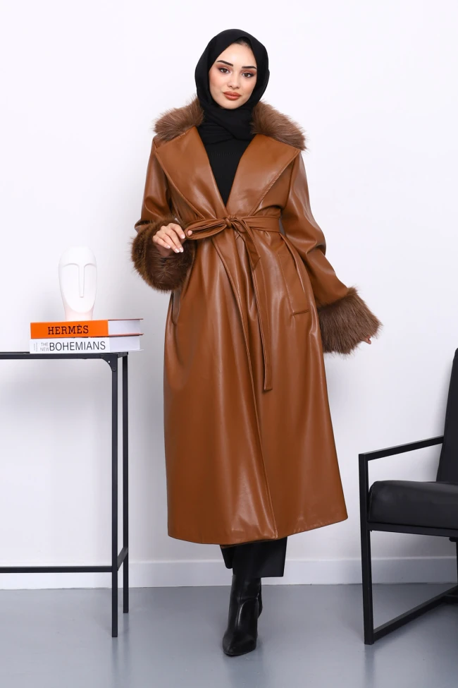 * Ürün Detay : Ürünümüz Suni Deri  Kumaştan Üretilmiştir. Yaka ve kol kısımları kürk detaylıdır. Bel kısmı kuşaklı ve ceplidir.
