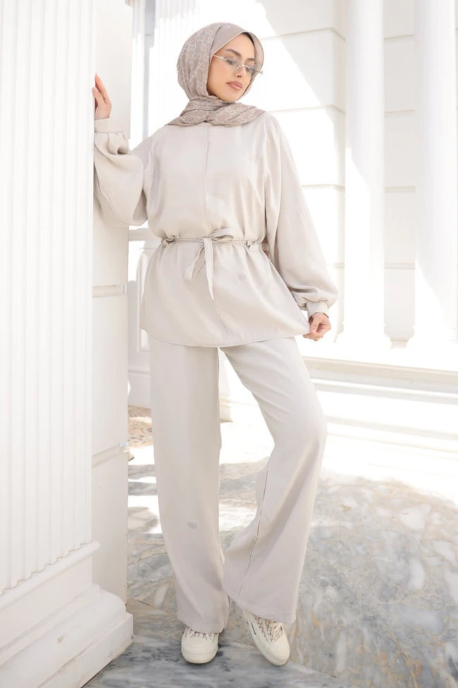 * Ürün Detay : Takım, doğal tonların asaletini ve fonksiyonel tasarımı bir araya getiren, koleksiyonunuzun en güçlü parçalarından biri olmaya aday.Üst parçada kullanılan kendi kumaşından ince bağlama kemeri, oversize bir tasarımı anında daha feminen ve derli toplu bir forma sokmuş. Belin vurgulanması, boyu olduğundan daha uzun gösteren bir illüzyon oluşturuyor.Balon kol yapısı, manşetlerdeki daralma ile birleşerek modern bir hacim oluşturmuş. Düşük omuz kesimi ise takımın o "çabasız şıklık" havasını destekliyor.Pantolonun boru paça yapısı ve kumaşın dökümlü dokusu, tesettür giyimde aranan o zarif ve hatları belli etmeyen silüeti başarıyla sağlıyor.Pantolon bel lastiklidir.