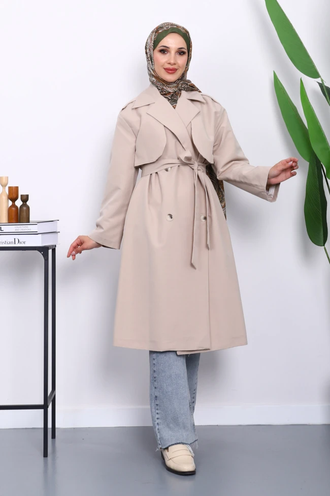 Haki Kravuze Yaka Kuşaklı  Cepli Trençkot Lacivert Kravuze Yaka Kuşaklı  Cepli Trençkot Bisküvi Kravuze Yaka Kuşaklı  Cepli Trençkot