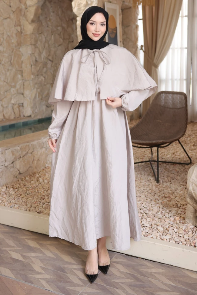 * Ürün Detay : Elbise, hem modern hem de geleneksel çizgileri birleştiren, oldukça karakteristik bir tasarıma sahip.Elbisenin en dikkat çekici özelliği omuzlardan göğüs hizasına kadar inen pelerin parçası. Bu detay, elbiseye hem sofistike bir hava katıyor hem de tesettür giyimde omuz ve göğüs hatlarını çok şık bir şekilde gizliyor.Beldeki hafif büzgü, formun fazla salaş görünmesini engelleyerek zarif bir silüet oluşturmuş. Lastikli kollar ise pelerin detayıyla dengeli bir bütünlük sağlıyor.